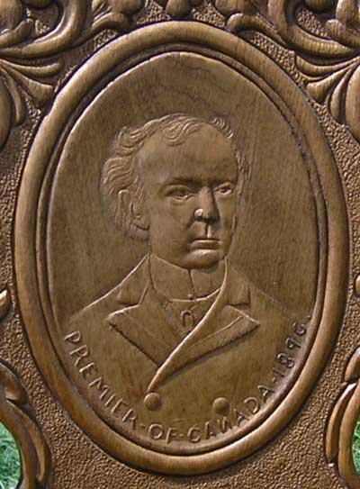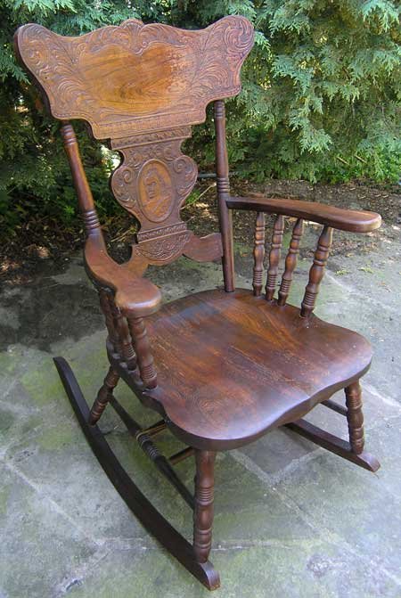 This is the finest Canadian pressback rocker ever made and shows the decoration that made them a work of art even though they were entirely machine made. The swirling plant decoration is art nouveau style which flourished at the turn of the century. Far too often these pressback chairs have been stripped down to their original wood surface losing the dark rich patina that it took a hundred years to put on the wood surface. There is alligatoring where the varnish surface has become pebbled showing this is the untouched original finish.