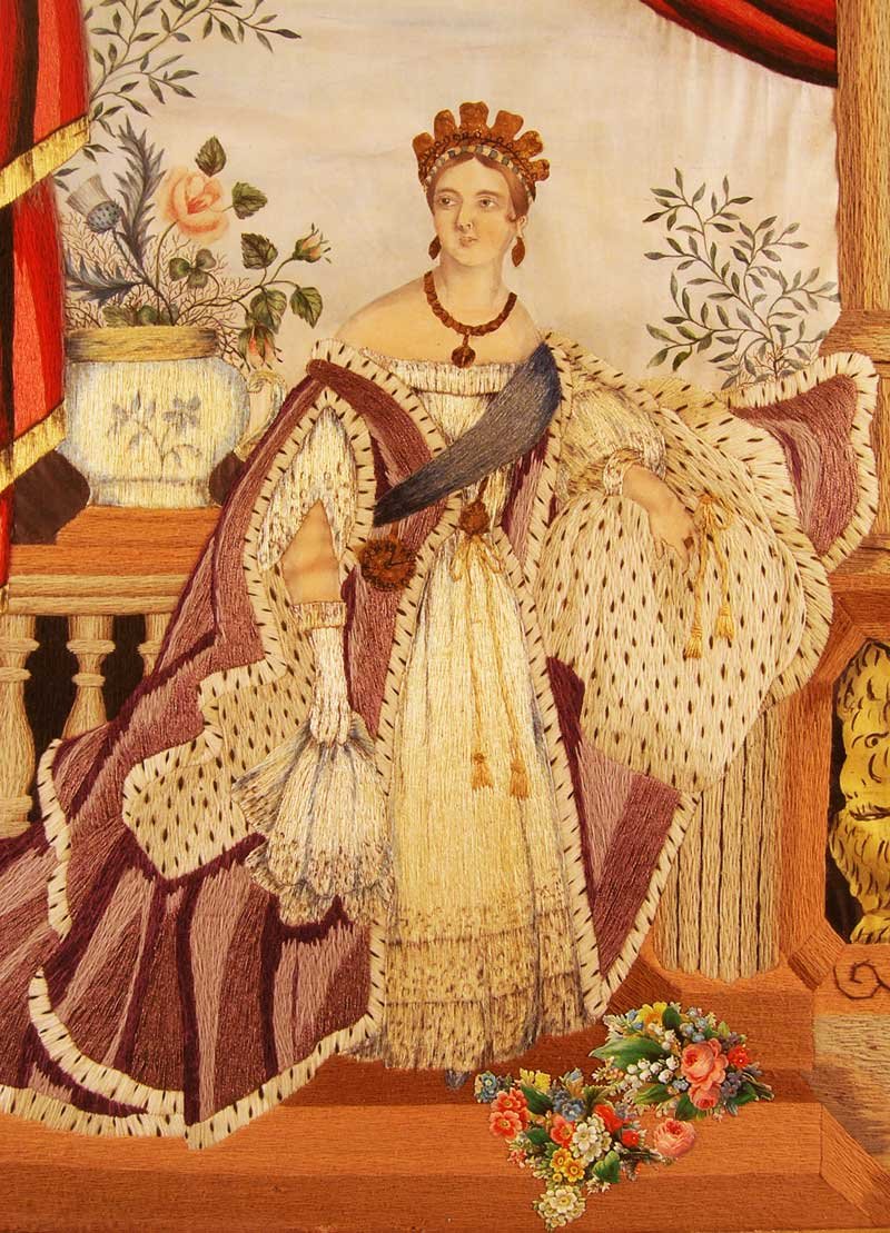 Annie Rogers was 14 when she made this piece in 1872, only five years after Canadian Confederation. The Rogers were Americans who were relatives of the Cox family of St. Thomas, Ontario. After Annie died, this work was willed to the Cox family, who in turn willed it to Donna Powles, a collector of Victoriana whose estate sale, in 2008, finally brought this fabulous artistic treasure to public auction for the first time. This superlative creation by a teenage girl started with a painted sky backdrop and lion, as well as the face, neck, and hands, of the Queen.Almost everything else is laboriously constructed with individual threads of coloured yarn tightly stitched to form the patterns of curtains, gowns, flowers, and column.