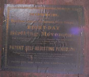 The Label: The Ansonia paper label, pasted to the outside back of the case, is in completely amazing condition, and gives both the old factory location at Ansonia (before 1880), and the new one at Brooklyn, New York (after 1883). The label would suggest the 1870s date, and Ansonia, as the place of manufacture for this clock. A company heading for New York and the big time, would hardly want to advertise itself as based in Ansonia, Conn. unless, at the time this clock was made and the label attached, it was still based in Ansonia.