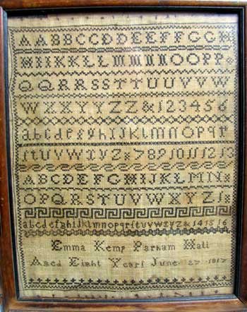 The finest memorial sampler we have ever seen, in memory of Mary Kershaw, a member of the founding family of Canada Steamship Lines. It is huge, and after 160 years still in fine shape. In the nineteenth century, in Canada, it was tragically true that for every family "In the midst of life, we are in death." Mary's final days were not easy; death - as recounted in the poem - probably a welcome relief. Nevertheless she was deeply mourned: the tears falling liberally from the heavens on her grave over which even the trees are bowed with grief. The death rate at the time was enormous, especially among the young. Mary Kershaw lived to what was considered a ripe old age, and died at 65. Today, with improved health care, better food and excercise, we believe the average person should be good for another twenty years. |