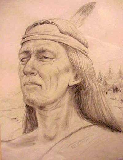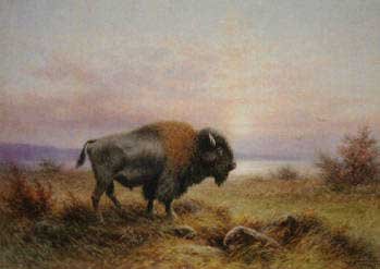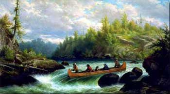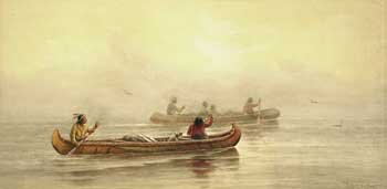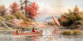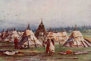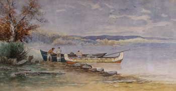 Frederick has given us a good view of a typical tipi used by the Woodland Indians for thousands of years - basically a simple tripod with extra poles, and draped with large pieces of birch bark. It was wide open at the top to let smoke out. A blanket door, held in place with another pole, also could be opened up to allow more light in. What is astonishing is the small size of the tipis. We assume Frederick got the proportions accurately. His painting makes two powerful general statements that apply equally to almost all of Canada's First Nations at the end of the 19th century. First, in marked contrast to the lifestyle of Canadians today, Verner illustrates that the Ojibway were entirely "outdoor people" only retiring to the interior of their small bark tents for a crowded night's sleep. |