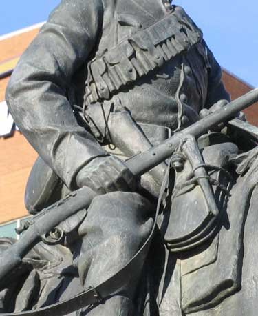 Her pose is uplifting, seemingly advancing, but not aggressively so; her weapon not threatening, just ready, should danger threaten; a fine face, a graceful figure, a symphony in motion, a stunning portrayal of a heroine for all time and all places.