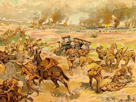 Paardeberg was the bloodiest battle of the entire Anglo-Boer War. It shows the Canadians staggering to a halt, under heavy Boer rifle fire from the trenches in the distance, where their wagons and tents are being blasted to pieces by British artillery.