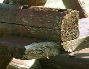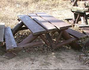 The tables had four and five inch legs snapped in half, two by six seats broken in half, table tops were broken apart, and everywhere huge chunks of wood had been gouged out of planks. Everywhere the freshly exposed garishly yellow wood laughed at me, set off glaringly against the dark brown paint.