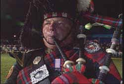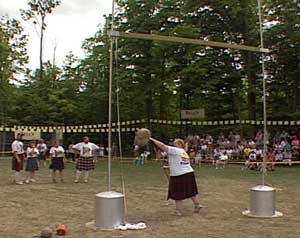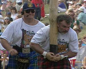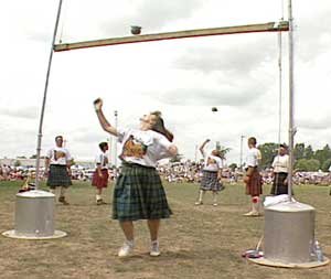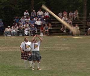 | If caber tossing, (below right, by champion Jim McGoldrick), throwing weights and stones of various kinds, or tossing the hammer are not for you hundreds of pipers compete in dance and bagpipe competitions during the day and night, keeping these equally important heritage events alive. |