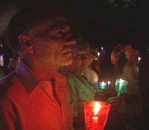Everyone takes time out to "march in the clans" (left), and in a candlelight parade remember those, who, in days gone by, brought flames from an old hearth, to a new one in a new land. |