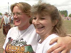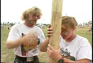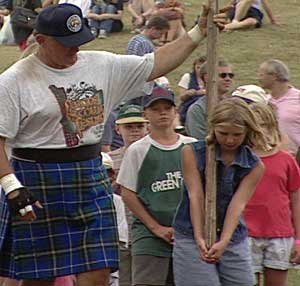 | A growing number of women are participating, from the very young (right), to those like Jackie Denny getting last minute pointers on caber tossing from her father. Say the old timers, "You don't have to be Scottish. We welcome everyone, but you do have to wear a kilt, be a Scot for a day!" |
