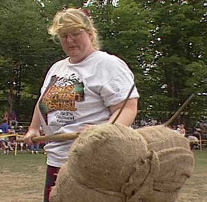 | Jackie Denny (right, on left) and Shelley Maitland share a laugh as they watch a competitor prepare for the Sheaf Toss (right), before Shelley takes her turn throwing the weight (below left) and Jackie takes her turn throwing the hammer (below right). |