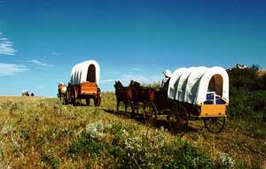 | Canadian families in 80 wagons and with hundreds of horses, relive the original trek west of the Mounted Police in 1873 by following the same route across hundreds of miles of prairie in southern Saskatchewan and Alberta.