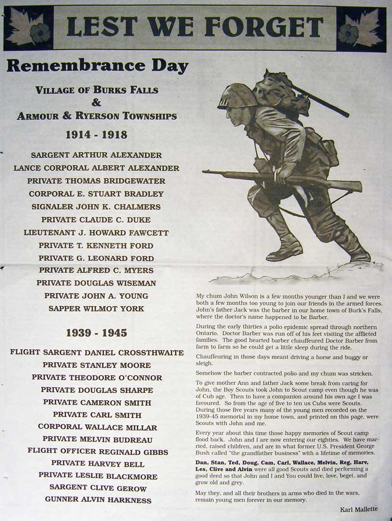 The War Memorials in Canadian towns and villages were set up - not for the handful of professionals who fought and died - but overwhelmingly to honour the thousands of boys and girls, civilians all, who downed their tools on peaceful civvy street to pick up, however distastefully, the fearful weapons of war, and died in total selfless service to their country.