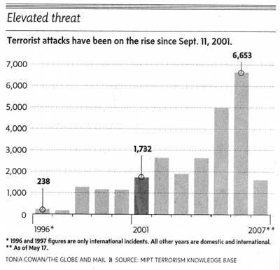 How Canadian, British, and American armed forces in Afghanistan and Iraq have drastically increased the number of terror attacks throughout the world. Before Canadians started shooting (2001-2005) terror attacks had been stabilized. To some that was fuel for optimism... Then the Canadian Forces put boots on the ground... The worst year for terrorist attacks ever, was the very time, early 2006, that Canadians implemented their shooting war in Afghanistan. Giving the lie to what politicians claim; in fact, far from reducing terrorism around the world, the shooting war by western European armies has drastically increased terror attacks everywhere, and made the lives of Judaeo-Christian white people - who are supposedly doing all the shooting for the good guys around the world - far less safe in their own countries. According to numerous independent experts (UN, Red Cross, NGOs, Amnesty International, etc.,) in 2007 and 2008 terrorist incidents, above all, civilian casualties, in Afghanistan have drastically increased. The more Canadians shoot the worse it gets. Go figure... In a stunning admission in 2008, both the British and US top generals have warned that they cannot "kill their way to victory" in Afghanistan. Only Canadian generals - alone in the world - following the credo of former top Canadian General Rick "Our job is to be able to kill people" Hillier, say they are winning, and should continue escalating the killing war for the "hearts and minds." Following their patron saint, General "Body Count" William Westmoreland of Vietnam fame. |