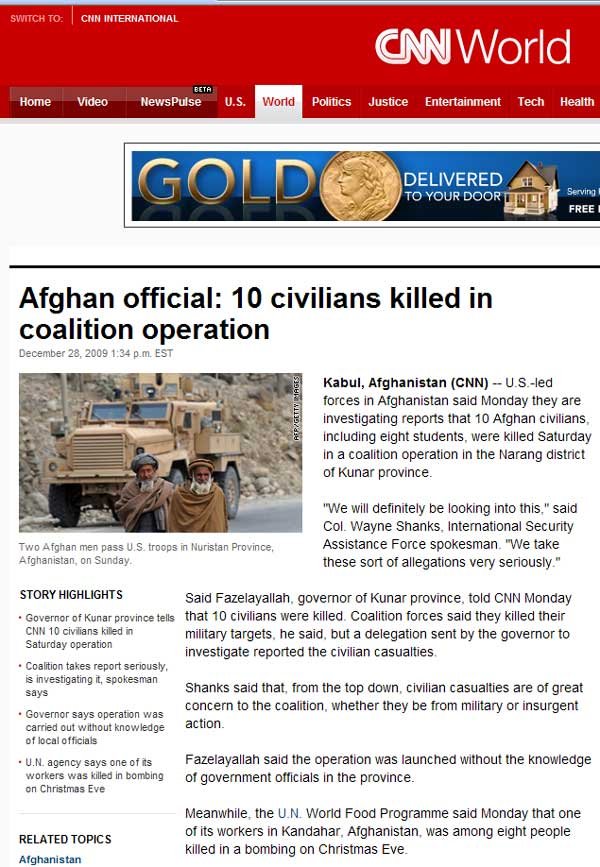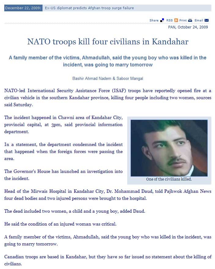 Exactly the same media censorship is going on in 2009, about the huge toll of civilians killed by Canadians and their NATO partners. Why, first because the media barons that run the media are Judeo-Christian and don't think Muslims are human beings like the rest of us; secondly it would make the war look bad instead of glorious, worthy, and wonderful. |