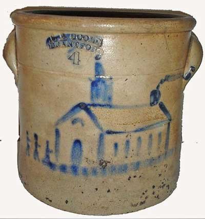 19th century Brantford Goold Stoneware Crock - students entering school, hairline, chips Final Price - $18,700 |