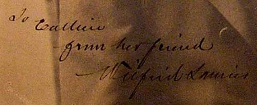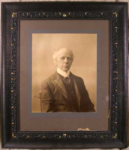 As a result, he is at the top of the list for Canadian Prime Minister memorabilia collectors. If you look extremely hard, and long, it is possible to find an original photo of Sir Wilfrid, an autograph, or a note in his hand. But to find them all in one is impossible you say? Recently at a small rural Ontario auction we did just that when we discovered this huge original photo portrait with original glass and frame still intact after a century. Wonderful enough! But at the bottom of the photo was an extremely rare treasure. A personal note to a friend, and the autograph of Sir Wilfrid himself: "To Calliers from her friend Wilfrid Laurier" |