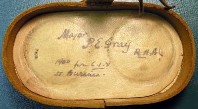 A fabulous find are the binoculars of Boer War Major PE Gray of the Royal Horse Artillery, in their original signed case. The personally signed binoculars are the highest level of signature you can get. This signature even provides time and place, with the CIV aboard the liner Aurania. Shipping records confirm Gray aboard Aurania with that contingent.