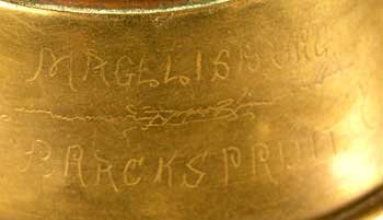 Presentation bugles are a very special kind of memorabilia because they can be tied to real people and a real time and place, with through the inscription, makes the attribution to Dr Molloy of Blackpool right foolproof. The wear on this inscription shows it is as old as the bugle itself so not a later bogus addition by a cunning forger. And it does happen. UK police investigators from Liverpool enquired about any information we could provide regarding an offer we had made on a bugle with an inscription which we had backed out of, fearing it was bogus.