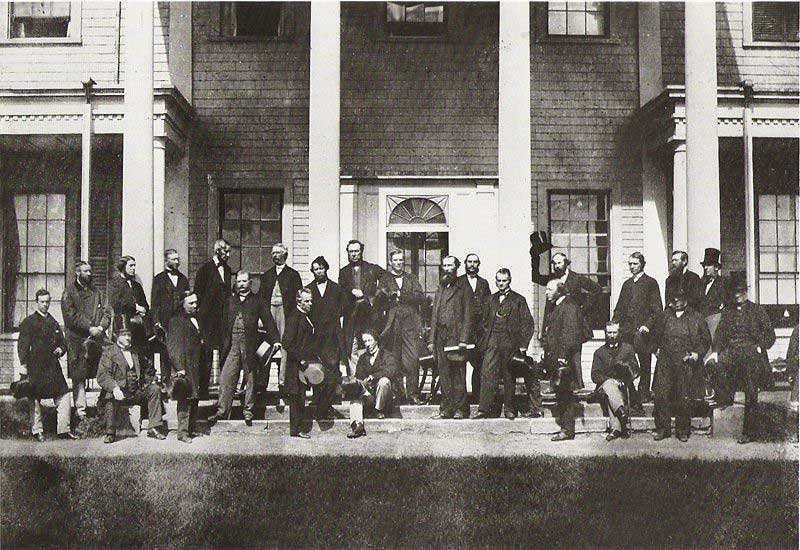 Sitting down in front, during the Conference, is John A Macdonald, the first Prime Minister of Canada to be, and standing in front of him, his main partner in forging the Dominion of Canada, George-Étienne Cartier. Standing behind him in black beard and hair is the only Canadian federal politician ever assassinated - Thomas D'Arcy McGee, by an Irish Fenian sympathizer in 1868.