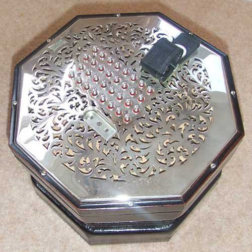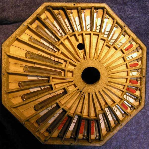 The steel reeds, each held in a brass rack by two screws, on the wooden tray (reed pan). The octagonal reed pan looks the same when flipped over, featuring 32 identical reeds to play the same note when the bellows are reversed. On the other end of the concertina is another reed pan, with 64 more reeds again repeating 32 more notes on opposite sides..