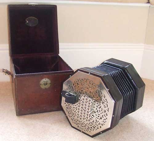 The English concertina is an English invention, patented in 1829 by Charles Wheatstone, an English inventor, who registered updated improvements in 1844. The instrument became wildly popular in early Victorian times (1837 -1860).