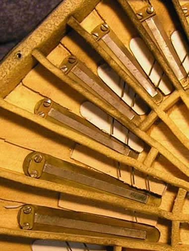 Flipped over from covering the reed pan is the underside of the end panel showing the pads at the end of the levers triggered by the buttons that control air getting through to the reed pan compartments over which the lid is tightened.
