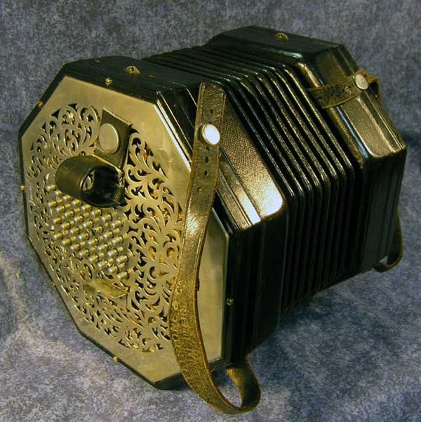 This is an English concertina, as distinct from an Anglo concertina, its closest, and more unruly, cousin. The English concertina plays the same note when the bellows go in or out, whereas the Anglo is like a harmonica, with a different note when blowing or drawing, or bellowing in or out. This means the English concertina can sustain notes longer and so is preferable for accompanying folk songs, and for lyrical, and melodious, slower popular songs, even symphonic compositions, whereas, when the Anglo reaches the end of the bellows run you have no choice but to change notes... Anglos are the preferred concertina for fast Irish music, where jigs and reels and rebel songs don't demand long notes but rather rapid note changes. An Anglo is therefore pumped and is full of energy and preferred by wild men in wild folk bands. An English concertina is for intellectuals, but can play fast tunes just as well, but it's harder work since you can't just pump the bellows, like in an Anglo, to get your next note, but have to make a finger change on a button as well. |