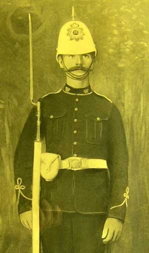 Below is a charcoal portrait of a Canadian Militiaman from the Riel era, dressed very much as Bertha's uncle would have been, with a red serge tunic and black serge trousers.