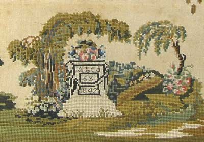 The finest memorial sampler we have ever seen, in memory of Mary Kershaw, a member of the founding family of Canada Steamship Lines. It is huge, and after 160 years still in fine shape. In the nineteenth century, in Canada, it was tragically true that for every family "In the midst of life, we are in death." Mary's final days were not easy; death - as recounted in the poem - probably a welcome relief. Nevertheless she was deeply mourned: the tears falling liberally from the heavens on her grave over which even the trees are bowed with grief. The death rate at the time was enormous, especially among the young. Mary Kershaw lived to what was considered a ripe old age, and died at 65. Today, with improved health care, better food and excercise, we believe the average person should be good for another twenty years. |