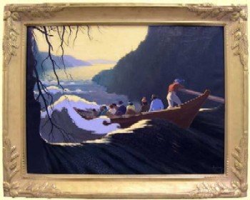 Limestone Hall: Robert decided to become a master builder himself and built Limestone Hall in 1853, right, for John McGregor in Halton County. The following year he married his niece, Ann McGregor. (In the 1960s Limestone Hall was the home of Lt. Col. Allan Burton, DSO, Chairman & CEO of the Robert Simpson Co. of Toronto. Inside was hanging his favourite painting, right, Shooting the Rapids (1930), by renowned Canadian painter Arthur Heming.)