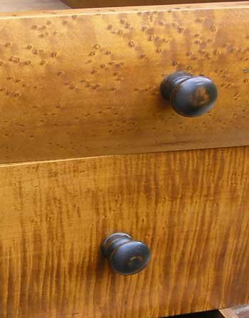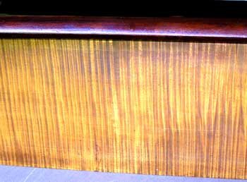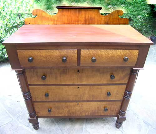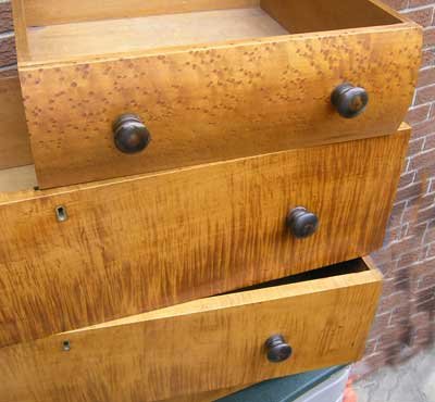 The choice woods available to Robert Stewart are evident here in the exquisite bird's eye maple top and tiger maple bottom drawer fronts. And in the finest backsplat we have ever seen adorn a Canadian antique piece of furniture, made of a solid chunk of tiger maple.