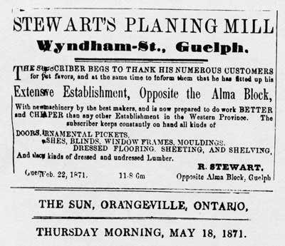 Robert Stewart Company: In 1854, newlyweds Robert and Ann Stewart, moved to Guelph, Ontario, where he started a steam-driven planing, flooring, and sash factory to cater to the enormous building boom going on in this part of Ontario.