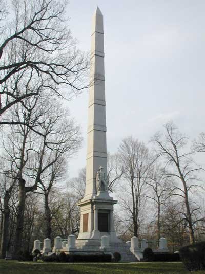 Only one period likeness of Tecumseh purportedly exists; the rest are mostly images made by painters with imaginations, years after he died. But there seems to be a strong likeness to his brother in this image. Tecumseh and his brother, the Prophet, tried to organize an Indian Confederacy to oppose the white settlers that were flooding in and stealing Indian lands west of the Ohio in the early 1800s. But, at the Battle of Tippecanoe in 1811, his Shawnee people were defeated, many fleeing to British Canada, where they joined the British side to fight off an American invasion when the War of 1812-1814 broke out between the US and Britain (Canada). Years later, General William Henry Harrison, who commanded the US forces at the battle, used the slogan "Tippecanoe and Tyler too" to ride a frenzied popular anti-Indian tide to victory in the US Presidential elections in 1840. By then the Indians had been largely cleared out of Ohio and Indiana. But now the racist wars were rising to a fever pitch against the Indians west of the Mississippi River. The next fifty years would see untold thousands of Indians there, massacred, transported, or beaten into submission, and their lands expropriated for the superior white master race. And it had everything to do with the doctrines of whites as racially superior and the non-white Indians as racially and culturally inferior. Every person from Presidents like Jackson and Harrison on down to the dirt poor farmers believed it; many actually proposed that extermination was not a bad idea for members of such an inferior civilization. After the Battle of Tippecanoe, monument left, Harrison's soldiers burned down the Prophet's town, and dug up the Indian graveyard and scattered the bodies all over, treating them with no more ceremony than as if they were mere road kill...