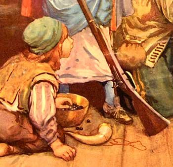 Simply Fabulous! JD has powerfully captured the essence of the story in this fabulous picture: Madeleine at the centre of the action, tamping home a load, her younger brother ready with the powder horn and extra balls in the pail - oops some have fallen on the floor - a wounded man reaching for another load of powder from someone pouring powder from a barrel. In the background the wailing women's cries mix with the clouds of smoke from the guns.