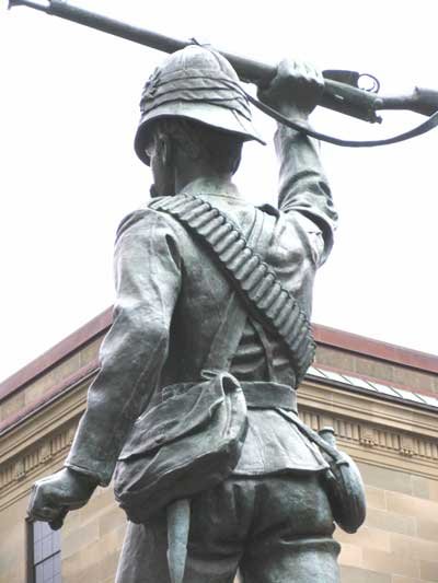Hamilton chose the middle ground, a cheery victory wave, probably after the Battle of Paardeberg. It could symbolize that war, and the killing, is over and peace is nigh. Still, it shows the soldier was there to be counted when the country called, as a recruit for a job that needed to be done. It is a fine monument for a civilian who volunteered for war, but hailed the coming peace.