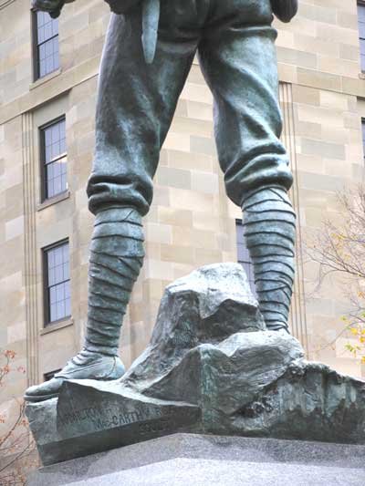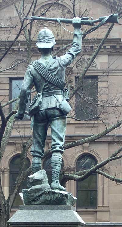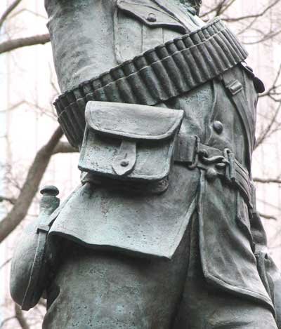 Hamilton mounted his marvellous bronze statue of a volunteer on top of a magnificent pedestal of alternate blocks of fashioned marble and granite. As usual he copied the uniform with strict attention to detail. But Hamilton always seemed to make his bullets on the bandoliers too large - his monument at Brantford shows the same oversizing - making them look like thick .45 calibre Martini-Henry cartridges, which the Boers were using, instead of the slim .303 bullets the British and Canadians were using in their magazine loaded Lee-Metfords.