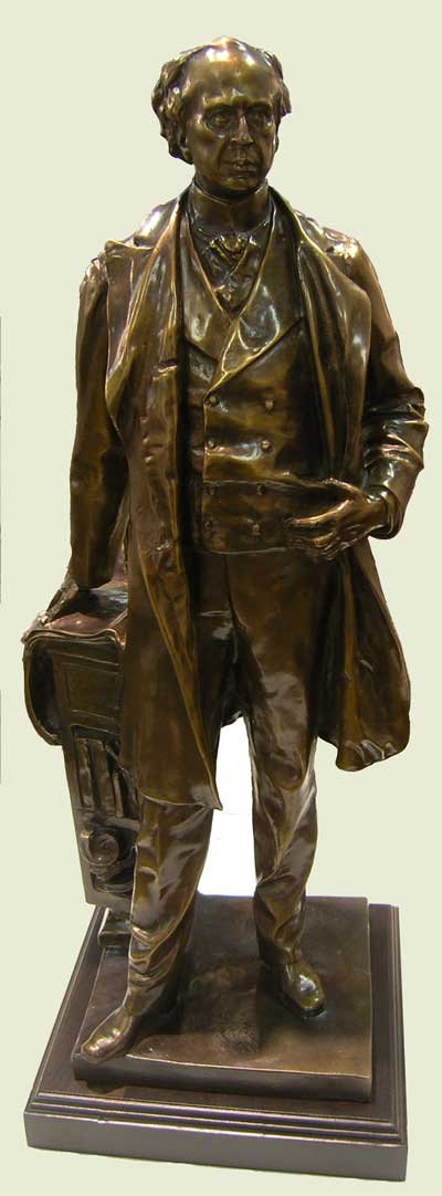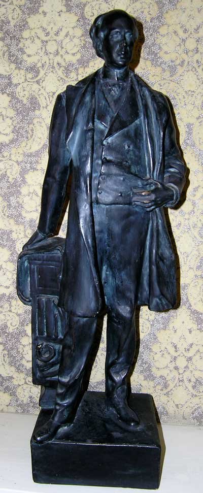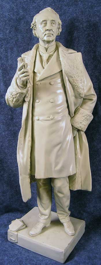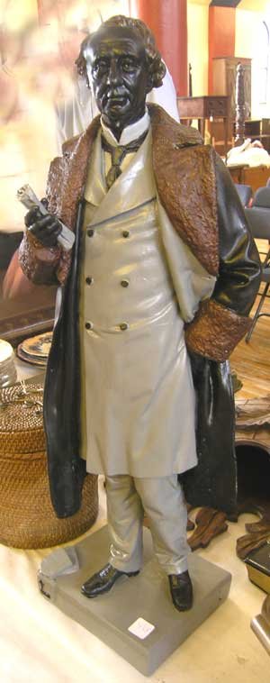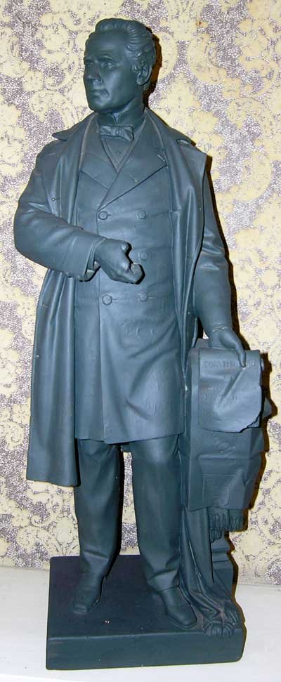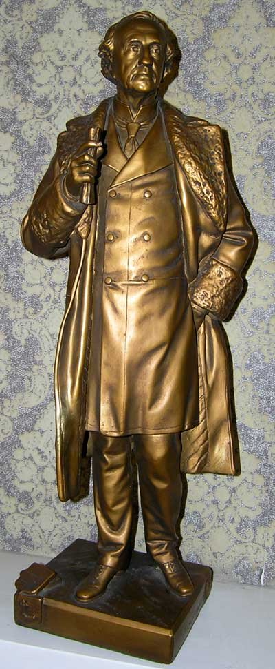 Canada's first prime minister is finished in bronze paint to look amazingly like it was cast in bronze metal. For some unknown reason this statue weighs exactly twice what the others do - including the duplicate John A below - so we surmised it might indeed be bronze. But it is plaster, confirmed by the scratch test in an unobtrusive part, the only way to tell a good paint job from metal. (Bronze does not allow a magnet test.) |