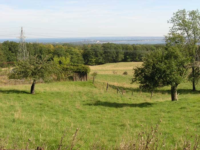 The view from the front window shows the remaining apple trees from the original garden area, and below, the field hacked out of a small piece of flat ground on a small plateau on the escarpment.