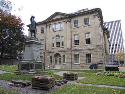 Outside Province House is a large bronze statue of Joe Howe by Philippe Hébert based on the maquette of the plaster statue he completed for the Fathers of Confederation series. Erected for a journalist - who had died in 1873 - by a grateful province, in 1904. William Lyon Mackenzie was another journalist the public honoured with a statue. |