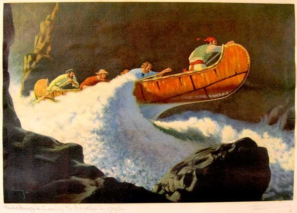 Signed and titled by the master himself is this stunning print of Mackenzie flying down the Fraser all aglow in Heming light. Heming has caught the danger, the incredible high that he himself had experienced by traveling down these same waterways and tempting the same enemy - huge waves, and menacing black rocks ready to drown you or tear you to pieces and spit you out at the bottom.