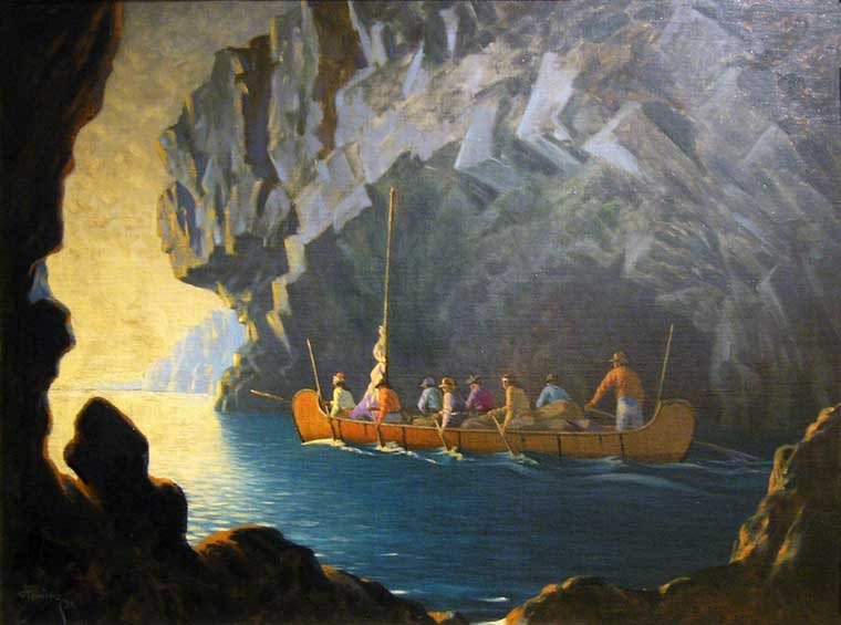 This stunning painting, illustrating a part of the Canadian experience, hung in Canada House in London, UK, for many years. Arthur used his fabulous mastery of light to tell a story, to elevate a simple canoeing picture to convey how the men felt as they travelled to a new land. Emerging from the enveloping and threatening jaws of a gloomy canyon (read life in Britain's choking, dark, and fetid tenements) the hearts of the pioneers are lifted up as they face a new dawn, with new possibilities, in a new land. Arthur has created a powerful metaphor for the Canadian experience for countless immigrants. |