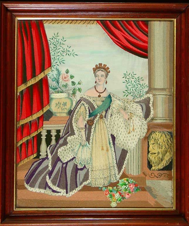 Annie Rogers was 14 when she made this piece in 1872, only five years after Canadian Confederation. The Rogers were Americans who were relatives of the Cox family of St. Thomas, Ontario. After Annie died, this work was willed to the Cox family, who in turn willed it to Donna Powles, a collector of Victoriana whose estate sale, in 2008, finally brought this fabulous artistic treasure to public auction for the first time. This superlative creation by a teenage girl started with a painted sky backdrop and lion, as well as the face, neck, and hands, of the Queen.Almost everything else is laboriously constructed with individual threads of coloured yarn tightly stitched to form the patterns of curtains, gowns, flowers, and column.