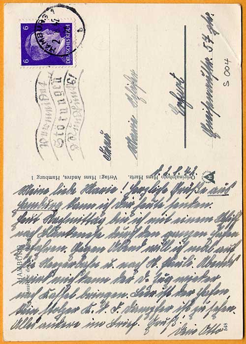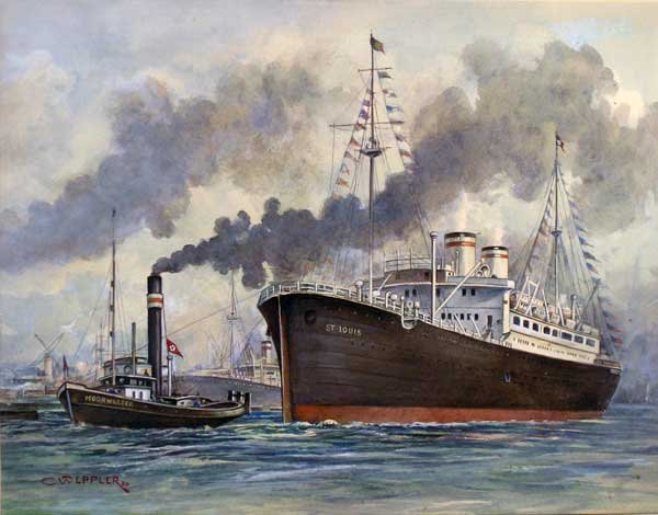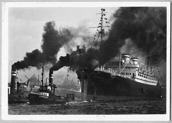 Clearly this photo was taken before the war, in the 1930s as the ship is being towed out of Hamburg harbour, where the postcard also originates.