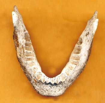 Canada's Greatest Arctic Disaster: In 1845 British explorer Sir John Franklin, in two ships, the Erebus and the Terror, and some 130 men, set out to find a way through the ice-bound channels around the north end of the Canadian arctic. They never returned, and within a couple of years, search parties set out by land and sea to try to reach the spot in the arctic where they might possibly be. But all that was ever found were relics and bones. It turned out that the ships were frozen in and the men abandoned them and tried to walk out, south to Hudson's Bay posts. None of them made it. Relics were gathered from Inuit people who salvaged what the men abandoned or dropped as they died of starvation. During a seal hunting expedition, historian John Goldi trekked along the southern shore of King William Island, following the trail by skidoo during April, the same month the men died along the shore, when the land was snow-free, but the ice was still thick on the sea. He found numerous cairns containing bones, set up in the 1930s by Hudson's Bay Manager Paddy Gibson FRC. The jaw bone, left, probably from a cabin boy who was on the expedition, was found alone, along the shore by an Inuit hunter who was accompanying John Goldi. "Kabloonak! Not Eskimo" he said. There are no teeth, indicating scurvy had ravaged through the gums of the dying men as they stumbled on to their deaths. |
