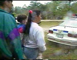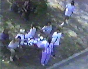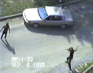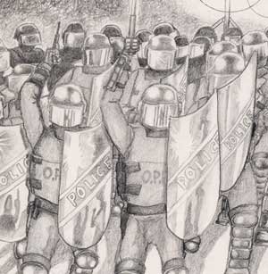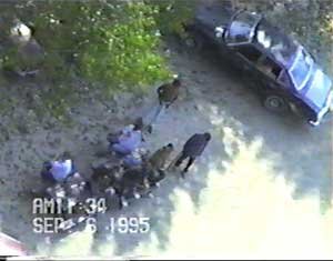 In our interviews with Indians who had been present when Dudley was shot near midnight, the same story kept cropping up, that the day before the murder of Dudley George, the families, teens, children, women with babies, etc. were sitting on picnic tables late at night having a good time. When suddenly OPP officers - apparently they had murder in their hearts - stormed up in police cruisers three abreast, and without warning, crashed into the tables, scattering women, children, babies, and men in all directions.