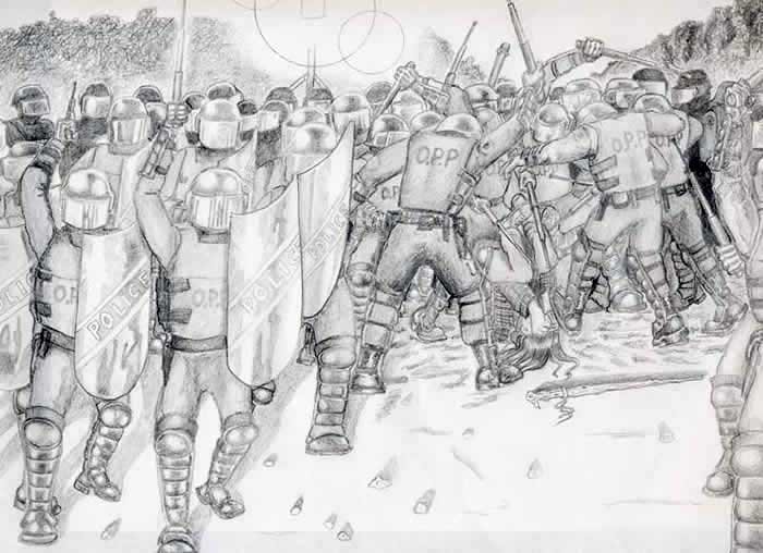 I tried to picture the scene of pandemonium on the road ahead of me that night... Over 100 heavily armed and utterly panicked OPP officers jammed into a narrow road. Running wildly away from the Indians, shouting in a frenzy, their hobnail boots pounding on the pavement; shields, guns, metal batons, clashing against each other. Utterly unbelievable... but what witnesses said they saw, and court testimony revealed.