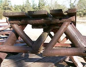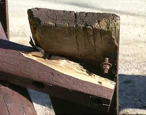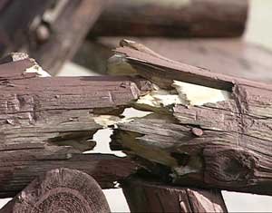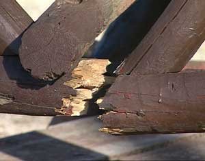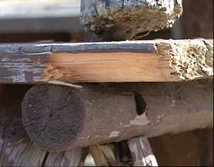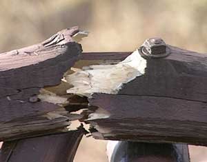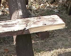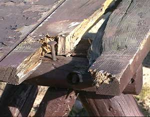 The tables had four and five inch legs snapped in half, two by six seats broken in half, table tops were broken apart, and everywhere huge chunks of wood had been gouged out of planks. Everywhere the freshly exposed garishly yellow wood laughed at me, set off glaringly against the dark brown paint.
