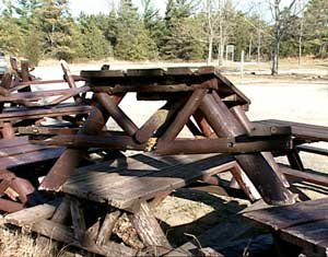 There, piled up on the side, were some dozen dark brown provincial park picnic tables.