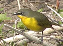 Birding appeals to people of all ages. (Above) A young birder is up at 6 a:m to see the first exhausted birds on the beach after flying during the night. A Yellow-breasted Chat rests on beach debris.