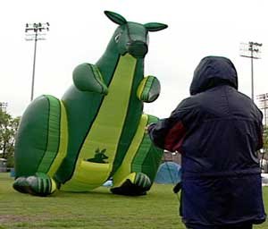 | Roger Maddy (above), tied up with four lines in each hand, and four more tied to his body harness, says "I guess it's the only 12 line kite in the world. I call it the Nerd bird." A show stopper, his kite seems alive as the Nerd bird loops the loop and then comes down and stands erect on the ground pulsing with life and then swoops away again. |