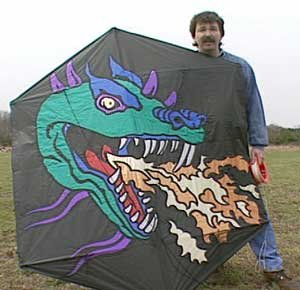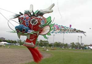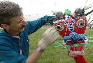 Ken Conrad (below, left) favours Chinese Dragon kites that have been made for over a thousand years. He says, "This one is called "The Hundred Children's Dragon Kite" because it carries 100 panels of individually painted stories with children in them. It's eyes roll in the wind and its tongue flops about!" |