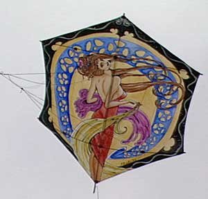 The beauty in these kites belies the beast! These are Japanese fighting kites. Says Mark Groshens (left), "Japanese fighting kites have been made for hundreds of years. The idea is that you try to entangle each other's kites and bring them down. The last one up wins!" |